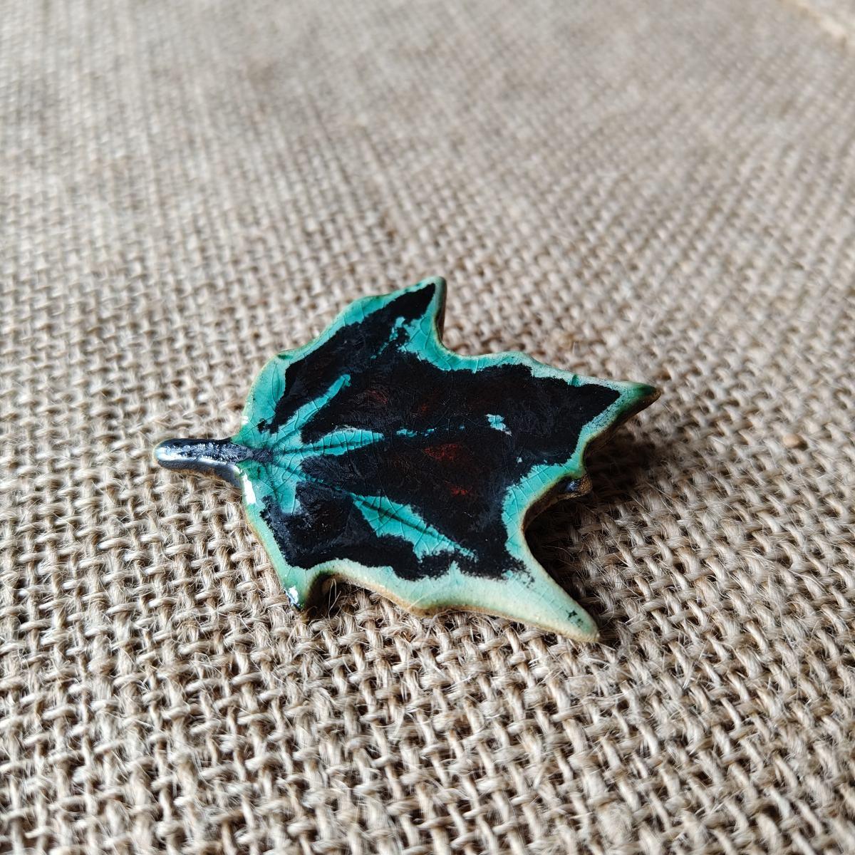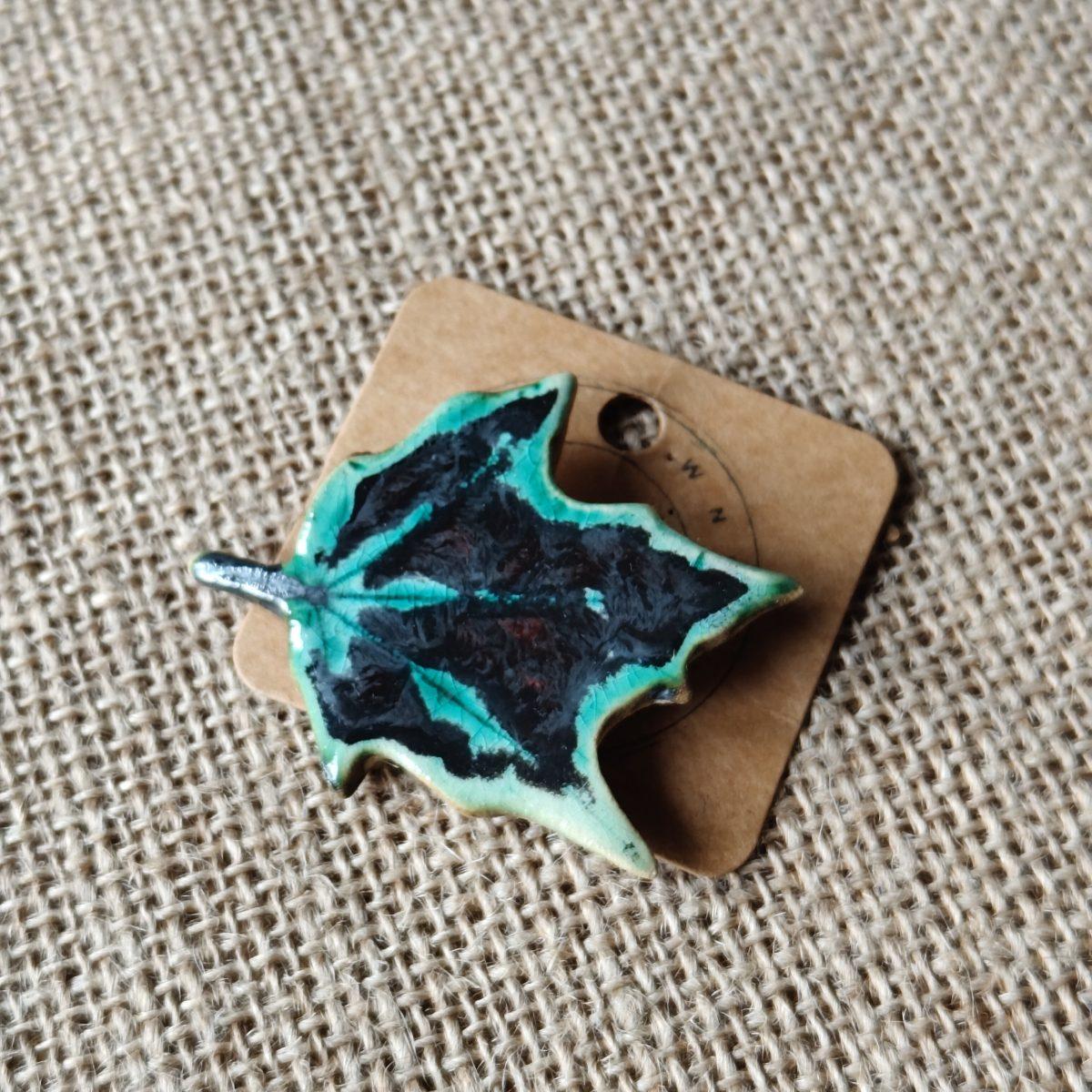 Ręcznie uformowana ceramiczna broszka w kształcie listka klonu.